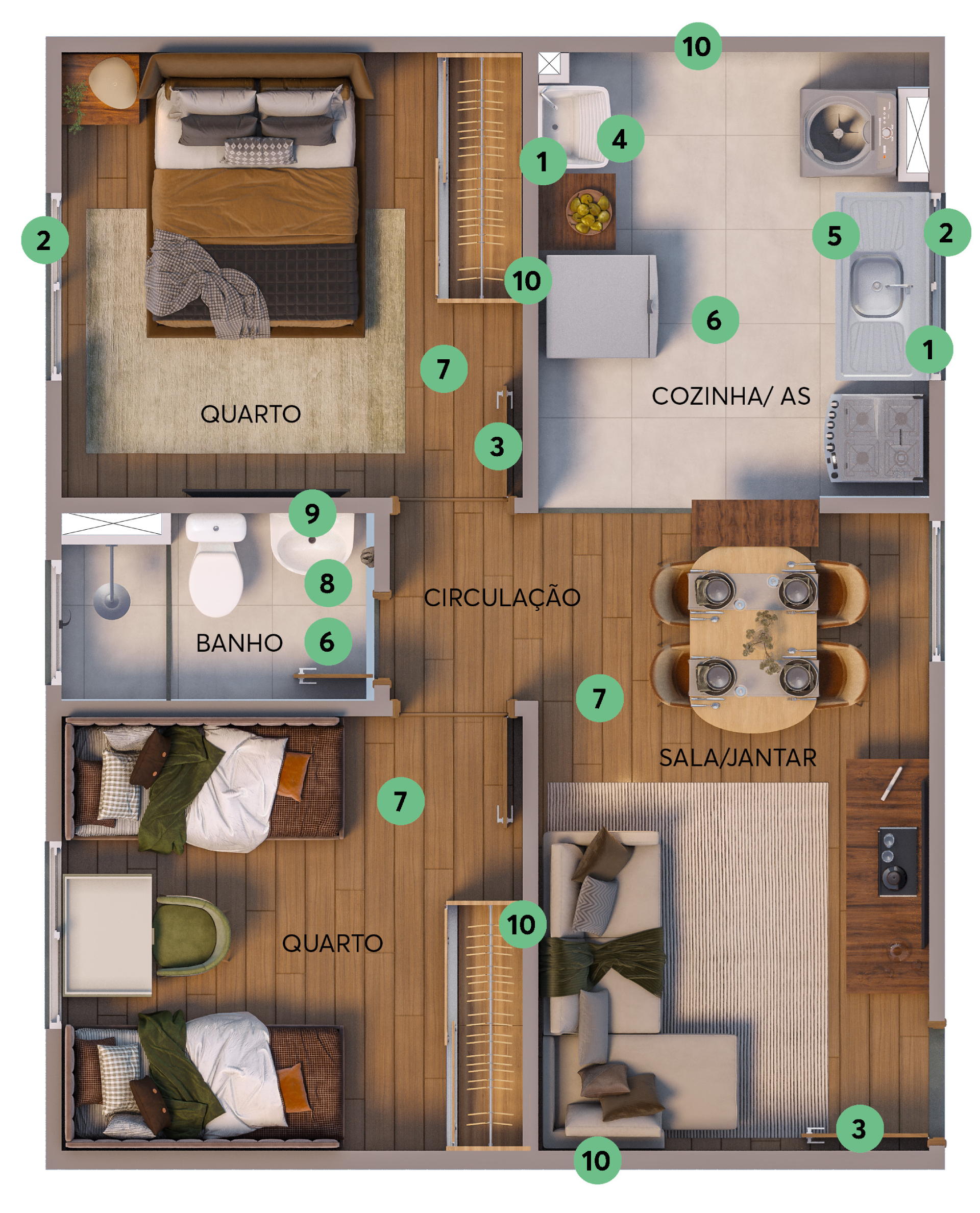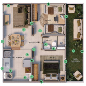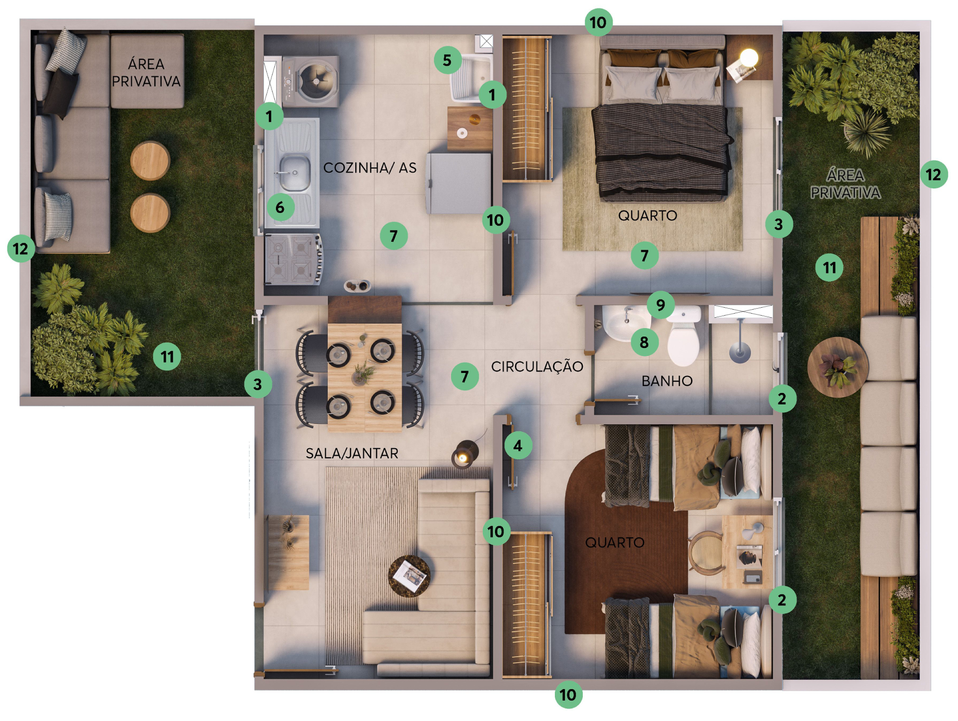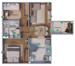 Os imóveis do Real Park são aconchegantes: apartamentos de 2 quartos e opções de varanda ou área privativa.