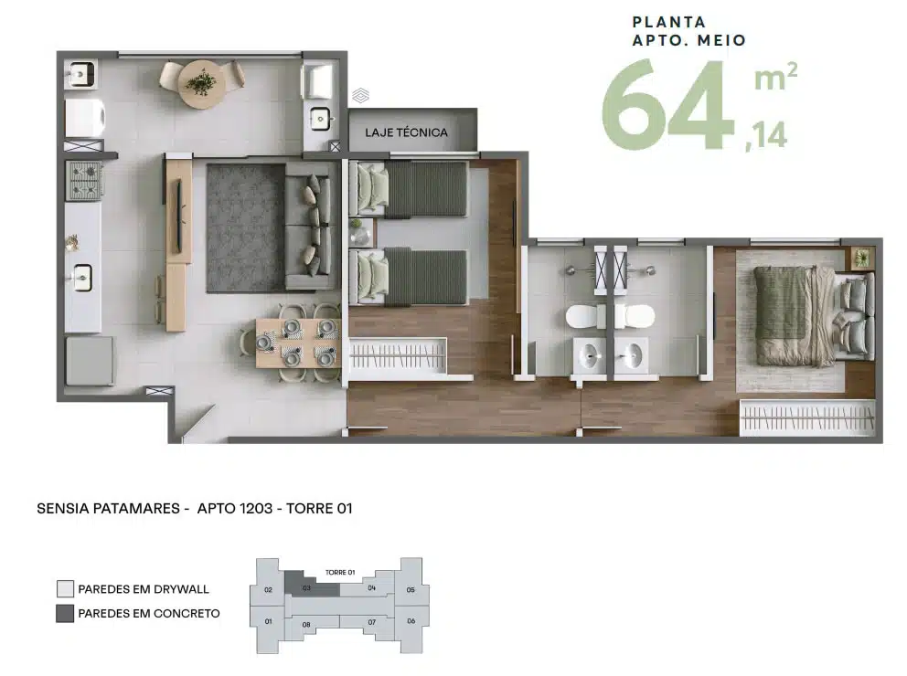 Os apartamentos são projetados para oferecer o máximo de conforto e estilo. Com plantas personalizáveis, você pode adaptar seu espaço de acordo com suas necessidades. As unidades variam em tamanho e layout, com opções que se adequam perfeitamente ao seu estilo de vida.